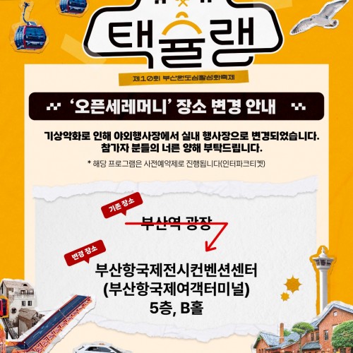 『제10회 부산원도심활성화축제』 택슐랭 자원봉사자 모집공고 1. 행사개요○ 행사명 : 『제10회 부산 원도심활성화축제』 택슐랭○ 기간..